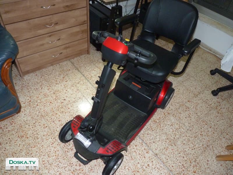Скутер для людей с проблемами передвижения на ногах - самодвижущееся кресло с электроприводом: четыре колеса, аккумулятор, привод на задние колёса, регулировка кресла (подъём, поворот), регулировка угла рулевой колонки, режим холостого хода (без привода), регулировка скорости движения (уставка), електротормоз, движение назад, управление ручное (!), расположение ног едущего на плоскости. Пробег на одной зарядке до 12 км или 1 час (в зависимости от рельефа и скорости), максимальный угол подъёма 12 град. ... Название на иврите - קלנועית