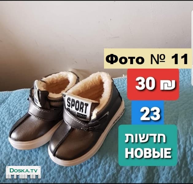 Детская обувь от размера 0+ до 37-го размера. Цена и размер написаны на каждой фотографии. Любая пара в единственном экземпляре. Есть Кроссовки, Туфельки, Ботинки, Сапожки, Пинетки, Первые шаги, Носки, Сандалики, Шлепанцы. Обувь для мальчика. Обувь для девочки. Теплая и Резиновая от дождя. Летная обувь. Встречу на остановке метронит в Крайот, на станции поезда “Моцкин”