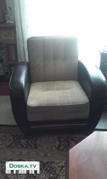 Два кресла цвета хаки, раскладные с ящиками внутри. Подлокотники из искусственной кожи коричневого цвета.