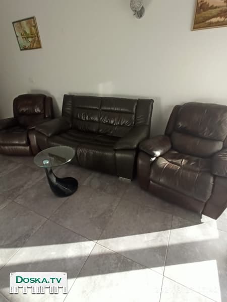 Гостиная из натуральной кожи в отличном состоянии - двухместный диван и 2 кресла, которые полностью раскрываются сидя и лежа. 1500 шек. Есть возможность купить вместе со столиком на картинке - все вместе за 1700 шек. Продаю в связи с обновлением.