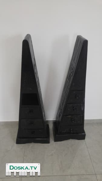 Продаю тумбы оформленные в виде пирамид. Могут вписаться в интерьер любой комнаты. В одной - нет верхнего ящика (вместо ящика, можно поставить что-то небольшое). Цена за тумбу с 4 ящиками - 100 шек. За тумбу, с 3 ящиками - 80шек. За обе тумбы - 150 шек. Торг уместен. Жду Ваших звонков)