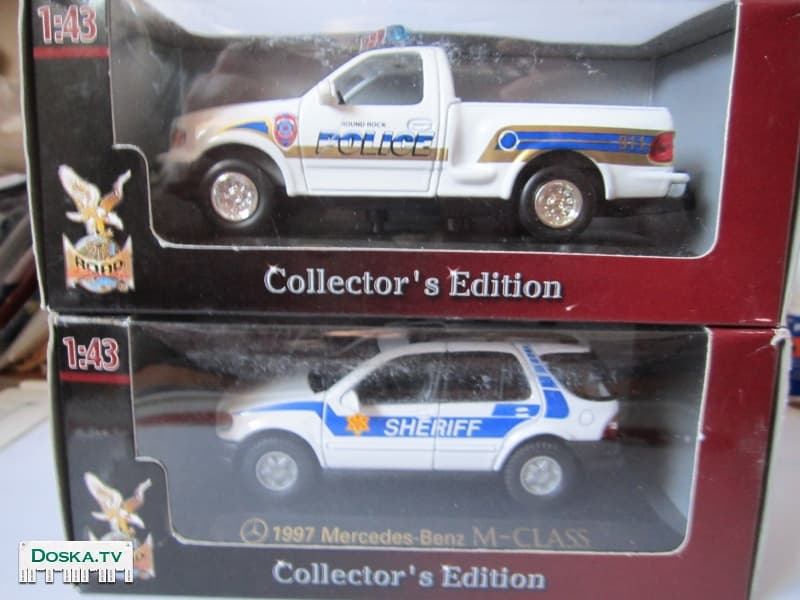 2 модели полицейские машинки фирмы "Yatming" в масштабе 1:43": Mercedes M class 1997. Ford Pick up F-150 1998. Длина прим.11 см. Сделаны в Китае. Состояние моделей -отличное,новое. Состояние коробок-среднее,с погрешностями. Цена 2 моделей -100 шек. Спасибо