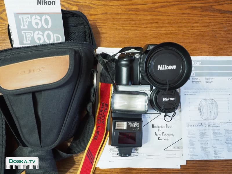 фотоаппарат плёночный nikon f60.объектив 28-80/3,5-5,6d+50/1,8d.вспышка starblitz 300dfni.чехол solidex.всё в отличном состоянии.документация прилагается.