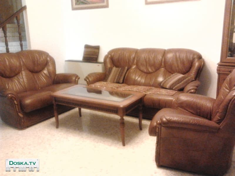 Салон-3+2+1 кожанный классического стиля, обрамленный деревянной отделкой коричневого цвета. Пр-во Италия.