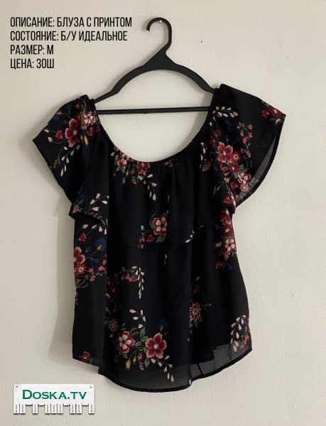 Шифоновая блузка черная с принтом. Размер М. Идеальное состояние