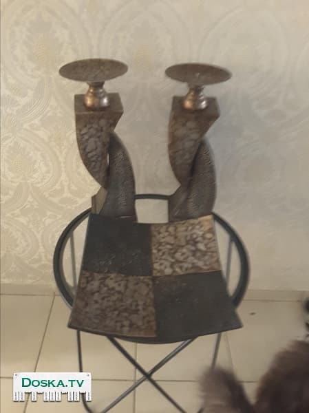 Очень красивый набор.Подсвечники и фруктовница.Материал металл.Покрытие очень редкое,которое не ржавеет,не темнеет,как называется не знаю . Керамическая пара 130 шек