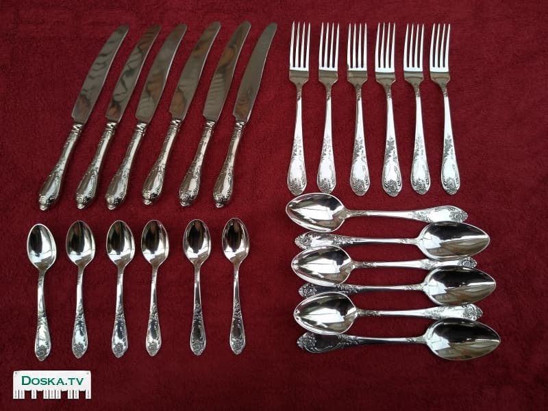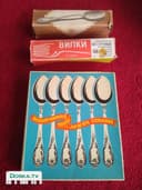 Столовый набор СССР. МЕЛЬХИОР! Продаем семейную реликвию. Столовые приборы 1970 года. НЕ ИСПОЛЬЗОВАЛИСЬ, ОТЛИЧНО СОХРАНИЛИСЬ. (Смотрите фото). Покрыты серебром! Упаковка сохранилась не от всех приборов. Материал: серебряное покрытие + основание приборов: мельхиор В наборе: 6 столовых ложек 6 столовых вилок 6 чайных ложек 6 ножей Пишите через сайт.