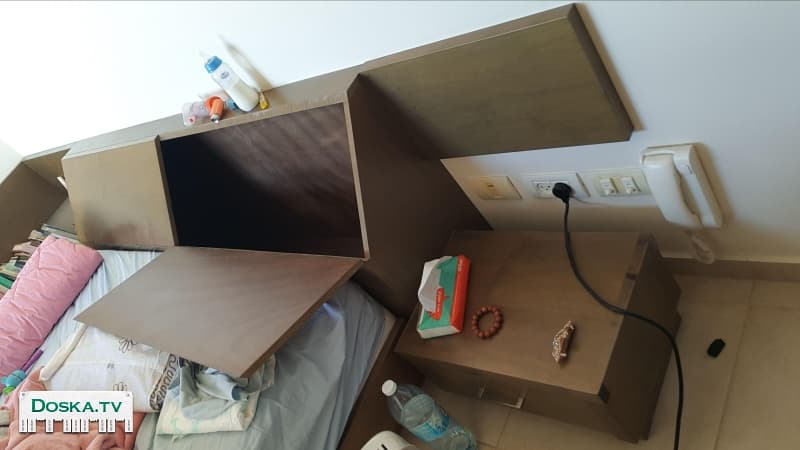 Спальная гарнитура ручной работы, большая кровать с матрацом, двумя зеркалми, двумя тумбочками и полочками для книг и для одежды.
