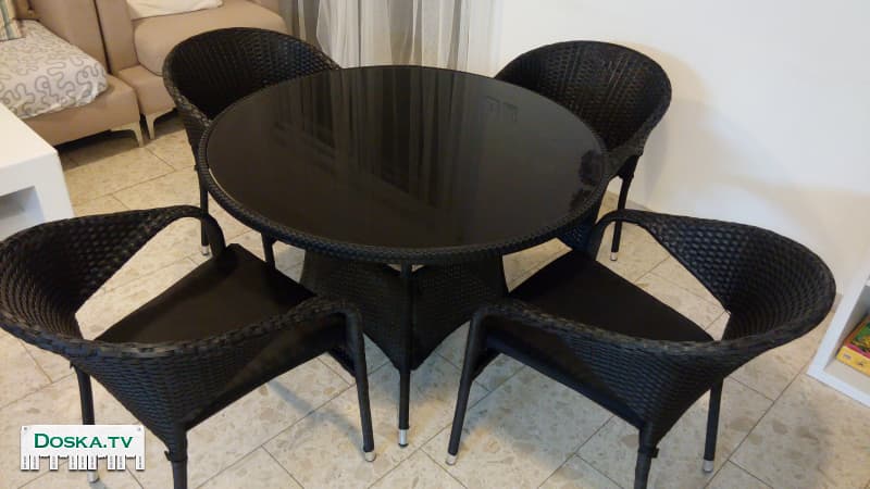 Продам стеклянный стол и 4 кресла в хорошем состоянии. плюс 5 подушек в подарок. цена 700 шек. звонки в в любой день недели до 22.00