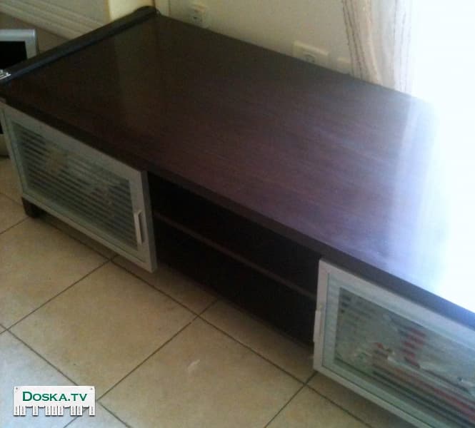 Тумба коричневого цвета в очень хорошем состоянии со стеклянными дверцами оригинального дизайна под телевизор, видео и аудио технику и другие принадлежности