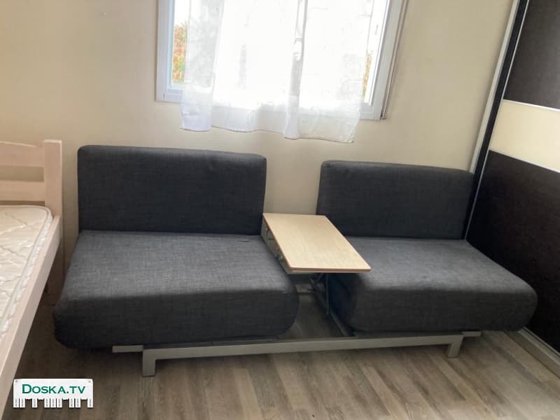 Диван серого цвета ИКЕА раздвижной со столиком внутри Тканевая обивка Внутри раздвижной столик Может использоваться как два полноценных спальных места Очень стильно смотрится Недостатки - сломаны ножки, однако, это не мешало нам спать на нем длительное время Забрать в городе Ашдод, до 3 декабря В доме есть лифт В аккаунте много другой хорошей мебели - можно сразу обставить всю квартиру