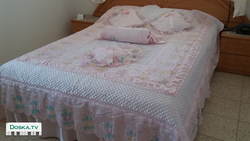 Продается новый комплект на двухспальную кровать: красивое атласное покрывало розового цвета с подушечками.