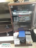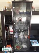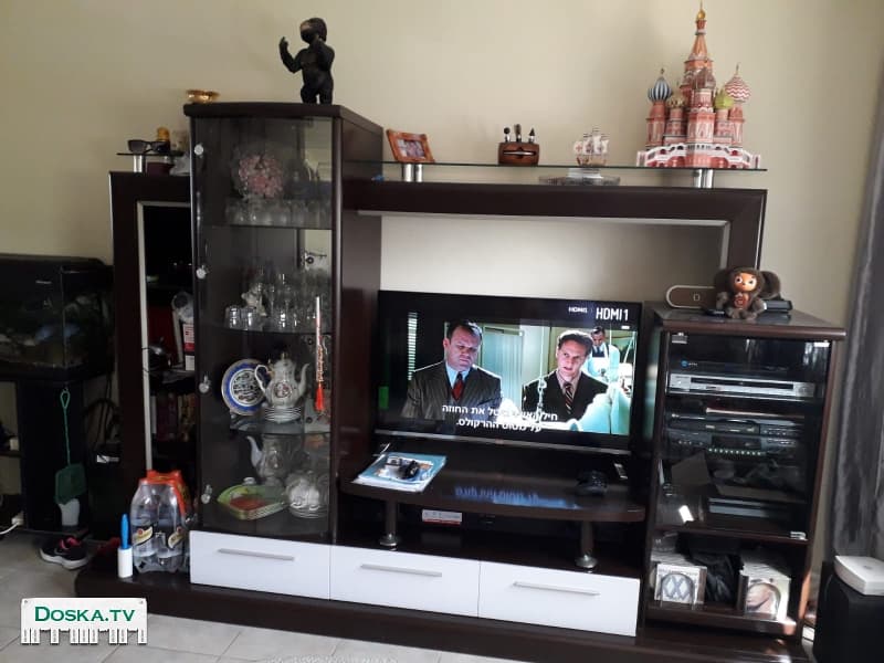 Стенка темных тонов и белыми ящичками с двумя витринами и тумбочкой под телевизор витрины с подсветкой очень вместительная