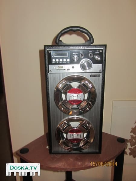Колонка с выходом usb и радио. Выход для микрофона. Подходит для работы артистов, учителей. Весит очень мало и удобна в работе.