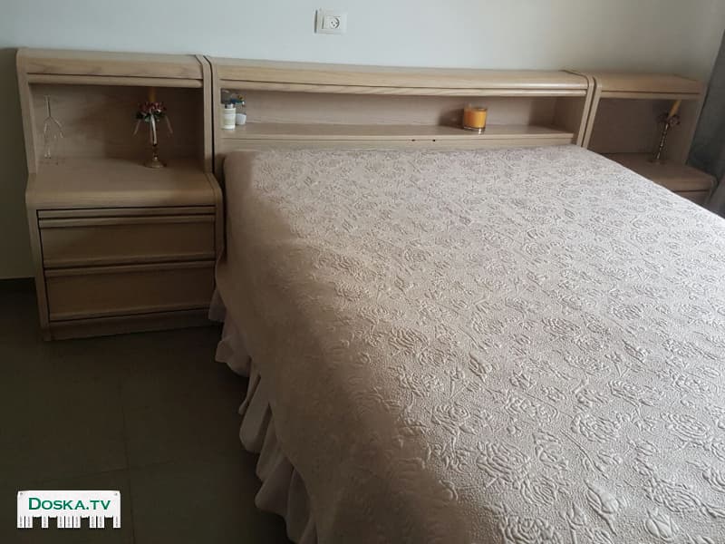 Спальня производства USA включает двуспальнюю кровать (160Х190) без матраца, две прикроватные тумбочки и комод с зеркалом.