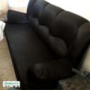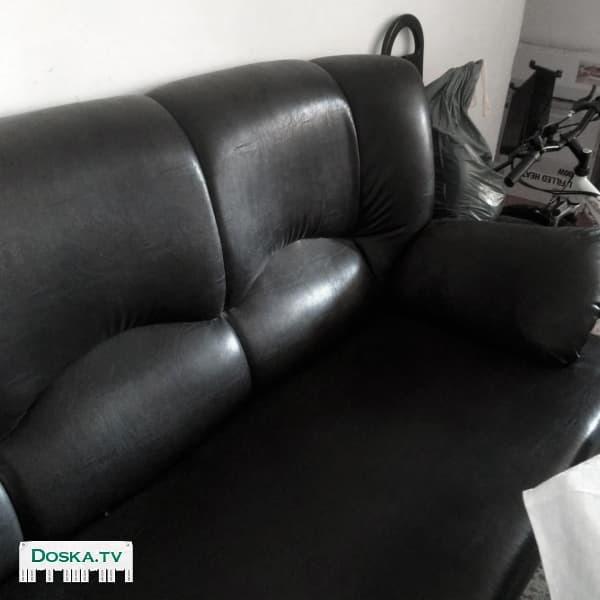 Диван трехместный на деревянном каркасе. Не новый, но выглядит великолепно, за исключением места, которое грузчики порвали при перевозке, это место есть на фото в увеличении. Металлические ножки.